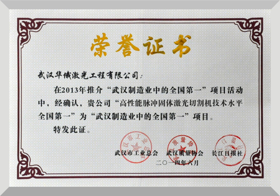 2014年6月11日,三部門共同商議決定對(duì)武漢首屆制造業(yè)中的全國第一項(xiàng)目予以表彰。武漢華俄激光工程有限公司的《高能脈沖固體激光切割機(jī)》技術(shù)水平全國第一,得到肯定并獲得頒獎(jiǎng)。